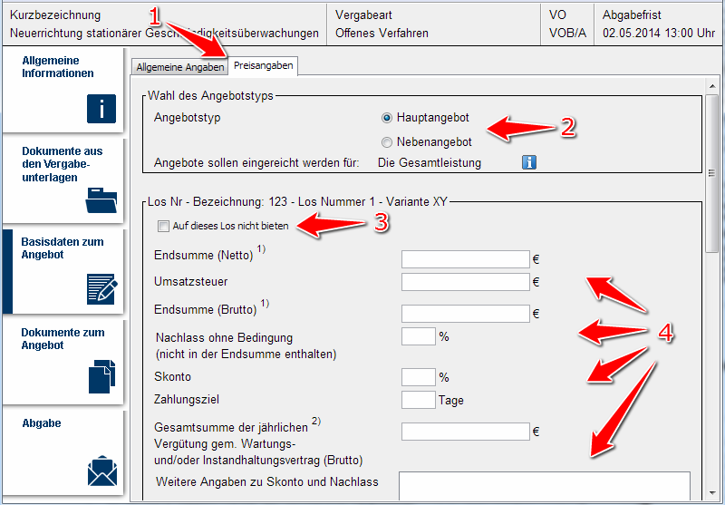 Die Aktion ist nur nötig, wenn die Vergabestelle festgelegt hat, dass Nebenangebote erstellt werden können. - Die Werte in die dafür vorgesehen Felder eingeben. Wenn Lose möglich sind, in den mit "Los Nr." gekennzeichneten Seitenabschnitten jeweils auswählen, ob für die angezeigten Lose ein Angebot erstellt werden soll oder nicht. Wenn hierfür kein Angebot erstellt werden soll, den Haken bei "Auf dieses Los nicht bieten" setzen (siehe Markierung 3 in Screenshot "Preisangaben vervollständigen"). Wenn zu einem bestimmten Los ein Angebot erstellt werden soll, hier die Preisangaben, Zahlungsmodalitäten etc. vervollständigen (siehe Markierung 4 in Screenshot "Preisangaben vervollständigen").