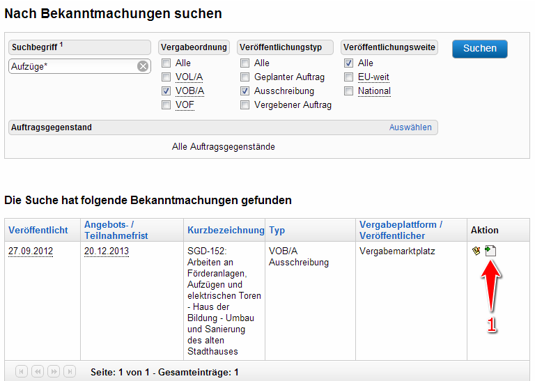 Die Suchergebnisliste wird unten auf der Seite angezeigt. Über sie können Bekanntmachungen geöffnet (angezeigt) werden.