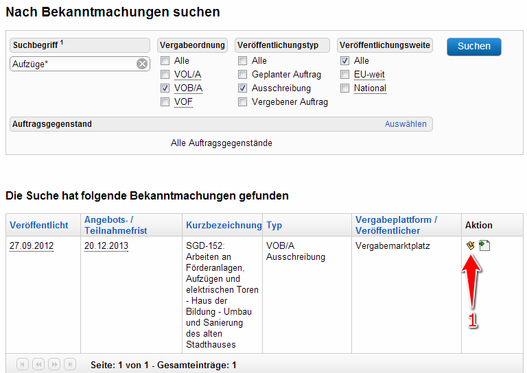 - In der Suchergebnisliste (sichtbar nach der Bekanntmachungssuche) die Bekanntmachung ermitteln, die geöffnet werden soll. In der entsprechenden Tabellenzeile das Aktionselement "Informationen zu diesem Projekt" anklicken (siehe Markierung 1 in Screenshot "Informationen zu gefundenen Bekanntmachungen anzeigen").