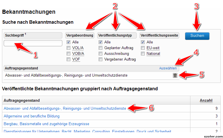 Im Modul "Bekanntmachungen" können die Benutzer nach öffentlichen Ausschreibungen sowie geplanten oder vergebenen öffentlichen Aufträgen suchen. Dabei können Suchbegriffe verwendet, der Auftragsgegenstandbereich festgelegt und weitere Filter eingesetzt werden (Suche nach bestimmter Vergabeordnung, einem bestimmten Veröffentlichungstyp oder bestimmter Veröffentlichungsweite). Interessant erscheinende Bekanntmachungen können vorgemerkt werden, z.B. um erst zu sammeln und später zu entscheiden, was nachhaltig interessant ist.