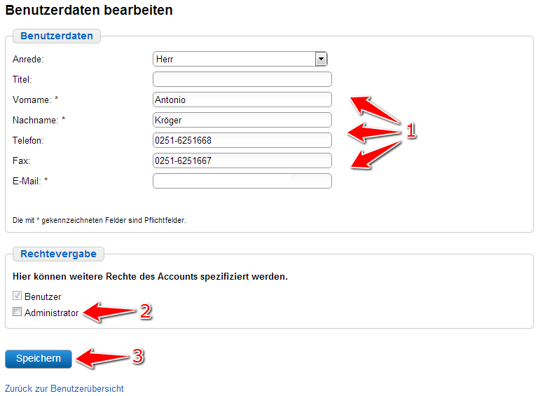An die für den Benutzer hinterlegte E-Mailadresse werden alle vom System generierten Nachrichten für diesen Benutzer geschickt, z.B. auch die Zugangsdaten. - Das Aktionselement "Speichern anklicken" (siehe Markierung 3 in Screenshot "Benutzer bearbeiten").