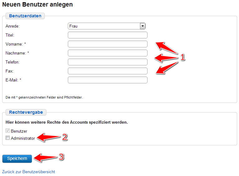 - Das Aktionselement "Speichern" anklicken (siehe Markierung 3 in Screenshot "Benutzer mit Administrationsrechten anlegen").