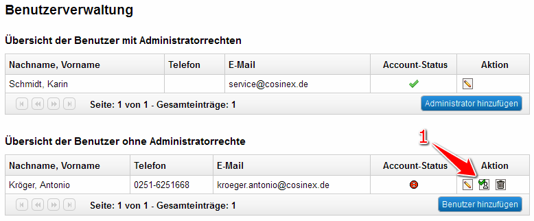 - In der Benutzerübersicht den Benutzer ermitteln, der entsperrt werden soll. In der entsprechenden Tabellenzeile das Aktionselement "Diesen Benutzeraccount entsperren" anklicken (siehe Markierung 1 in Screenshot "Benutzer entsperren").