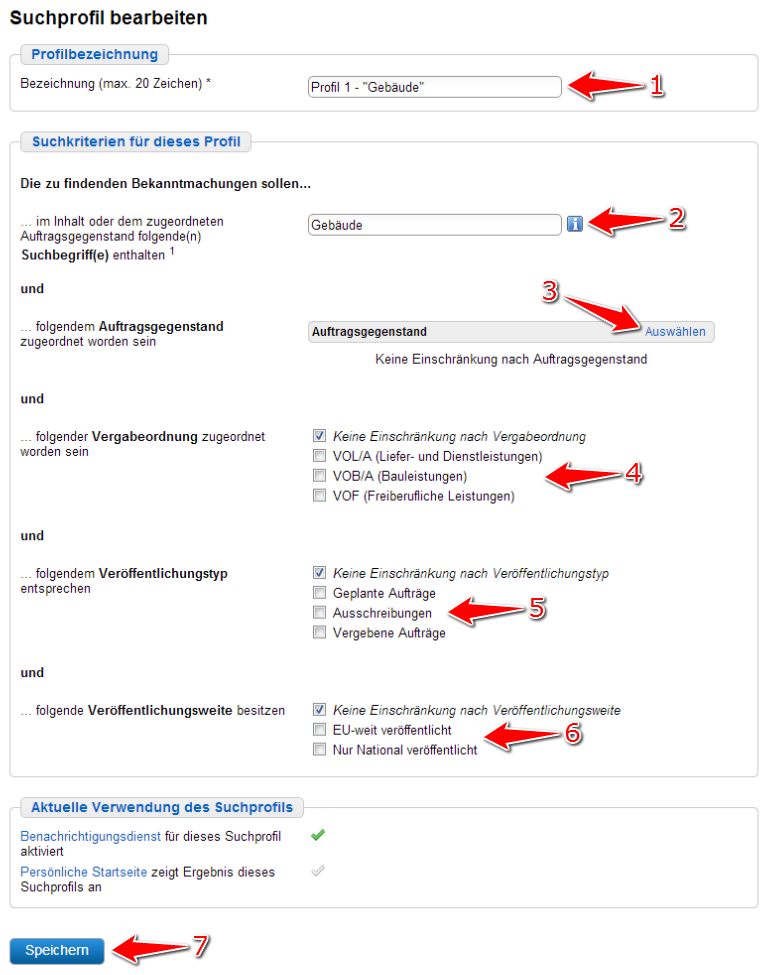 - Die gewünschten Profileinstellungen bearbeiten (siehe Markierung 1, 2, 3, 4, 5 und 6 in Screenshot "Suchprofile anlegen").
