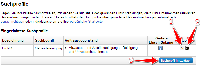 Im Modul "Suchprofile" können die Benutzer Sucheinstellungen für Bekanntmachungssuchen zusammenstellen, speichern und verwalten. Suchprofile können auf der persönlichen Startseite der Benutzer eingesetzt werden. Sie sind auch Grundlage für den Benachrichtigungsdienst (durch Suchprofile kann die manuelle Suche entfallen).